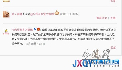 江西企業(yè)網(wǎng)2月20日南昌訊“南昌火車(chē)站附近的永和豆?jié){真夠黑啊!沒(méi)有下次了。”2月18日,一位名叫“張又幸福”網(wǎng)友發(fā)微博爆料稱(chēng),南昌火車(chē)站旁的永和豆?jié){很“黑”。隨后,永和豆?jié){官方微博回應(yīng)稱(chēng),該店確為永和豆?jié){公司加盟店,近期將終止與其合同。