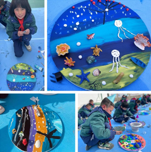 明媚的陽光下,小朋友們在操場席地而坐,拿著畫筆,用顏料涂出斑斕的海洋世界,用紙板制作千姿百態(tài)的海洋生物模型。
