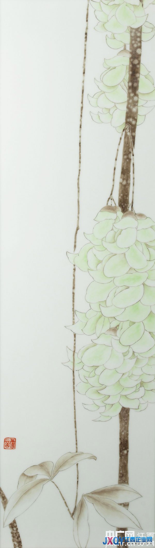 品讀朱希睿的瓷畫,能感受到對 “水靜猶明”的向往正是她的心境,她所創(chuàng)作的畫面也無不從中而來。一如坐于案前,托腮凝望,伴著幽幽沉香,或遙想,或感懷;又如窗前扶琴,一曲《瀟湘水云》在琴弦之間體會憑欄美景如畫;再如院中石階之上,泡一壺明前春茶,在水沸聲中望向石門之外的竹林鳥鳴;更如那書房習字,抬頭望向品屏風的一瞬間,仿佛置身于花海之間… …