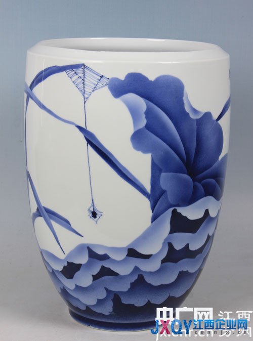 青花在他的筆下,再不是平面上的靜物,而是以其飽滿的姿態(tài),站立在陶瓷上。