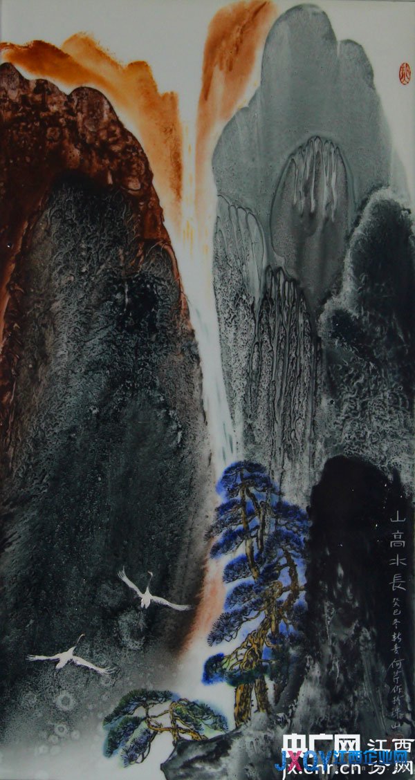 “進(jìn)行陶瓷山水畫(huà)創(chuàng)作源自我從小的愛(ài)好,我自小生活在大山里,對(duì)大山、藍(lán)天、白云、流水有著一種由衷的眷戀。”李新青說(shuō),將對(duì)山水的喜歡表達(dá)在畫(huà)面上是一件充滿幸福的事。他筆下大山大水大墨大彩,正應(yīng)了“天地有大美而不言”而美盡在其中。在作品《山高水長(zhǎng)》中,他運(yùn)用潑彩的手法表現(xiàn)出層層疊嶂的高山及刻畫(huà)綠樹(shù)青松,流水從高山而下,動(dòng)中有靜,兩只仙鶴翩翩起舞于美景之中,高山、流水、青松代表情深、長(zhǎng)遠(yuǎn),這是他對(duì)自己美好愛(ài)情生活的祝福和寄托。