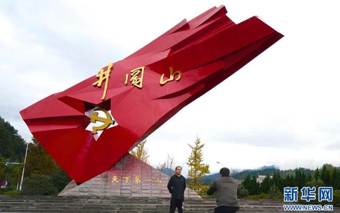 游客在井岡山的“井岡紅旗”雕塑前參觀留影(2018年11月21日攝)。 新華社記者 胡晨歡 攝