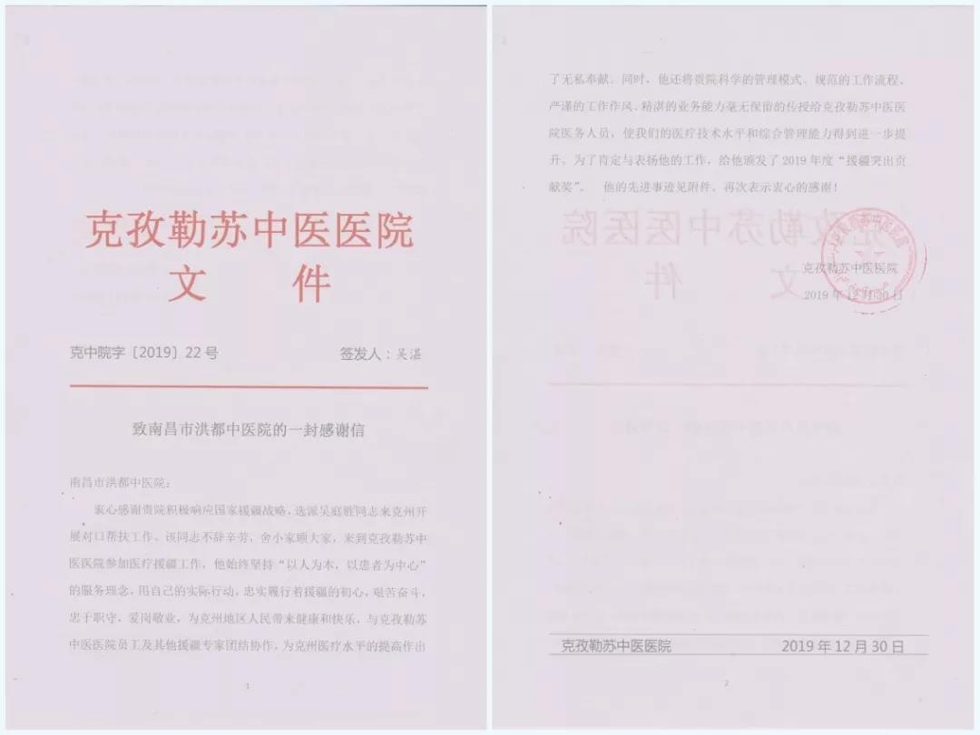 江西企業(yè)網(wǎng)訊 近日,南昌市洪都中醫(yī)院收到一封克孜勒蘇中醫(yī)醫(yī)院發(fā)來(lái)的感謝信。原來(lái),2019年,南昌市洪都中醫(yī)院選派的援疆醫(yī)生骨傷十科主治中醫(yī)師吳庭勝在克孜勒蘇中醫(yī)醫(yī)院擔(dān)任康復(fù)科主任的半年期間真情奉獻(xiàn),貢獻(xiàn)突出,不僅幫助當(dāng)?shù)蒯t(yī)生提高了診療水平,還為許多克州同胞帶去了健康和快樂(lè)。這是克孜勒蘇中醫(yī)醫(yī)院首次寫感謝信給支援醫(yī)院,信件雖然簡(jiǎn)短,但卻表達(dá)著他們對(duì)南昌市洪都中醫(yī)院大力支持援疆工作的綿長(zhǎng)感激。