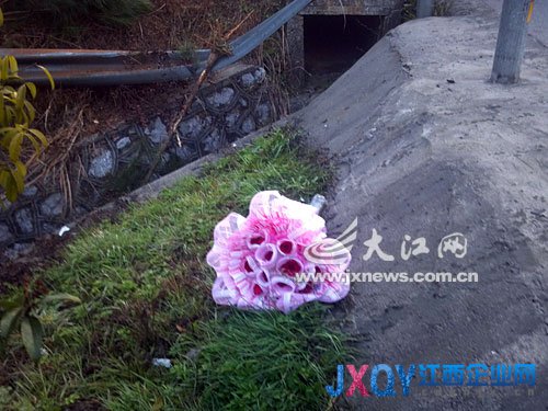 昨日清晨5時56分許,省交警總隊直屬二支隊第四大隊民警接警后趕到現(xiàn)場,只見一地的散落物,護(hù)欄外還有一束玫瑰花,卻不見車的蹤影。民警見護(hù)坡上的草木均被攔腰斬斷,遂沿著護(hù)坡望去,才發(fā)現(xiàn)護(hù)坡下方水槽內(nèi)有一輛車,車頭倒插在水槽內(nèi),車尾高高翹起,所幸車內(nèi)人員未受傷。